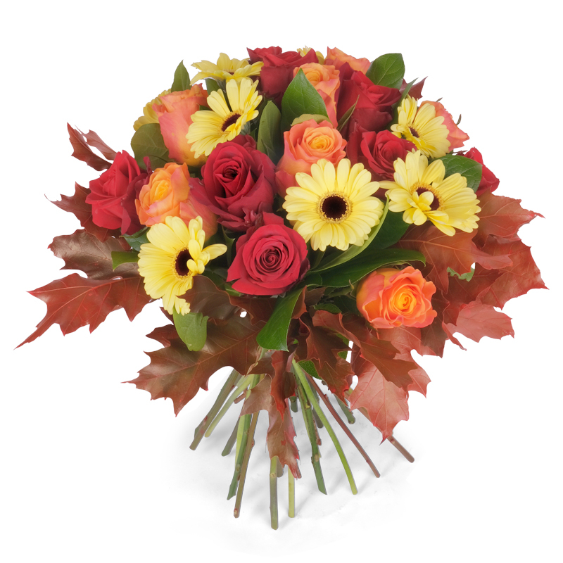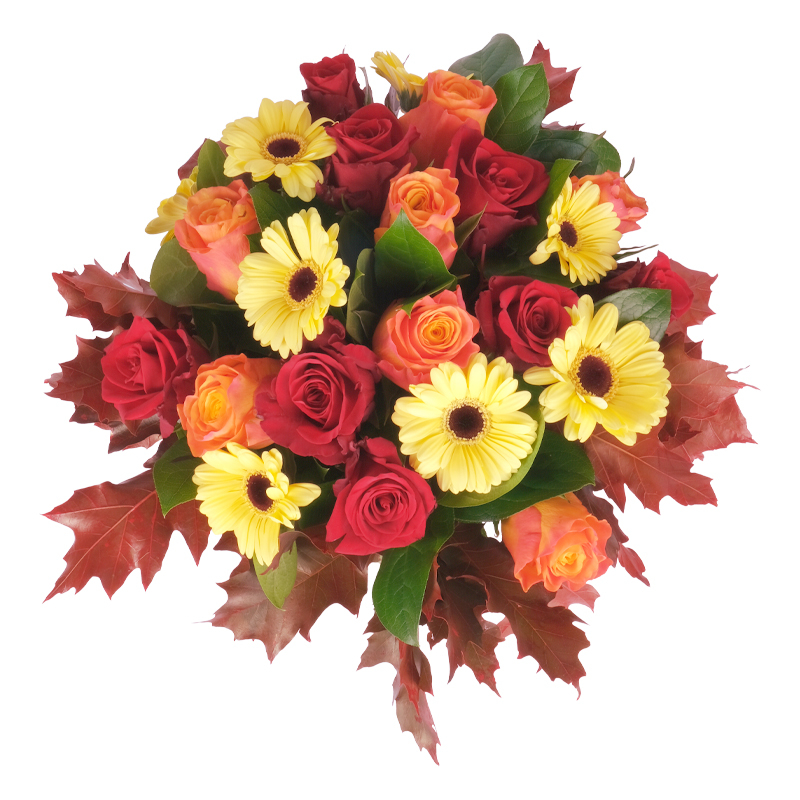 „Obfita Jesień” to bukiet, który oddaje ducha natury. Róże i gerbery tworzą harmonijną całość wśród liści klonu. Każdy element kompozycji współgra z innym. To propozycja pełna elegancji i wdzięku. Perfekcyjna propozycja na okazję i bez!