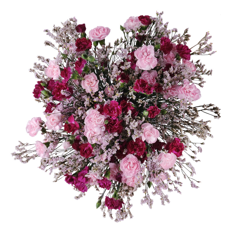 Bukiet „Z nutą goździka” to swobodna, lekka kompozycja, w której goździki gałązkowe zyskują nowy wyraz dzięki naturalnym, sezonowym dodatkom.