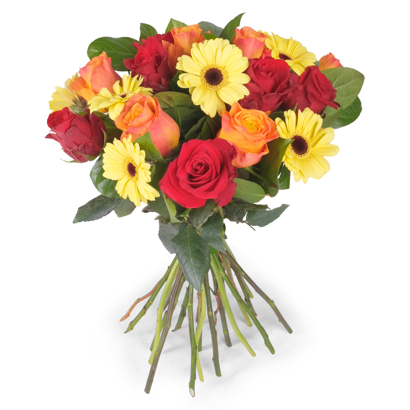 Zawsze świeże kwiaty Wyraz szczęścia zamknięty w kwiatach. Róże i gerbery tworzą kompozycję, która rozświetla każde wnętrze. To propozycja, która emanuje radością i ciepłem. Spraw komuś radość i wyślij mu promień słońca!